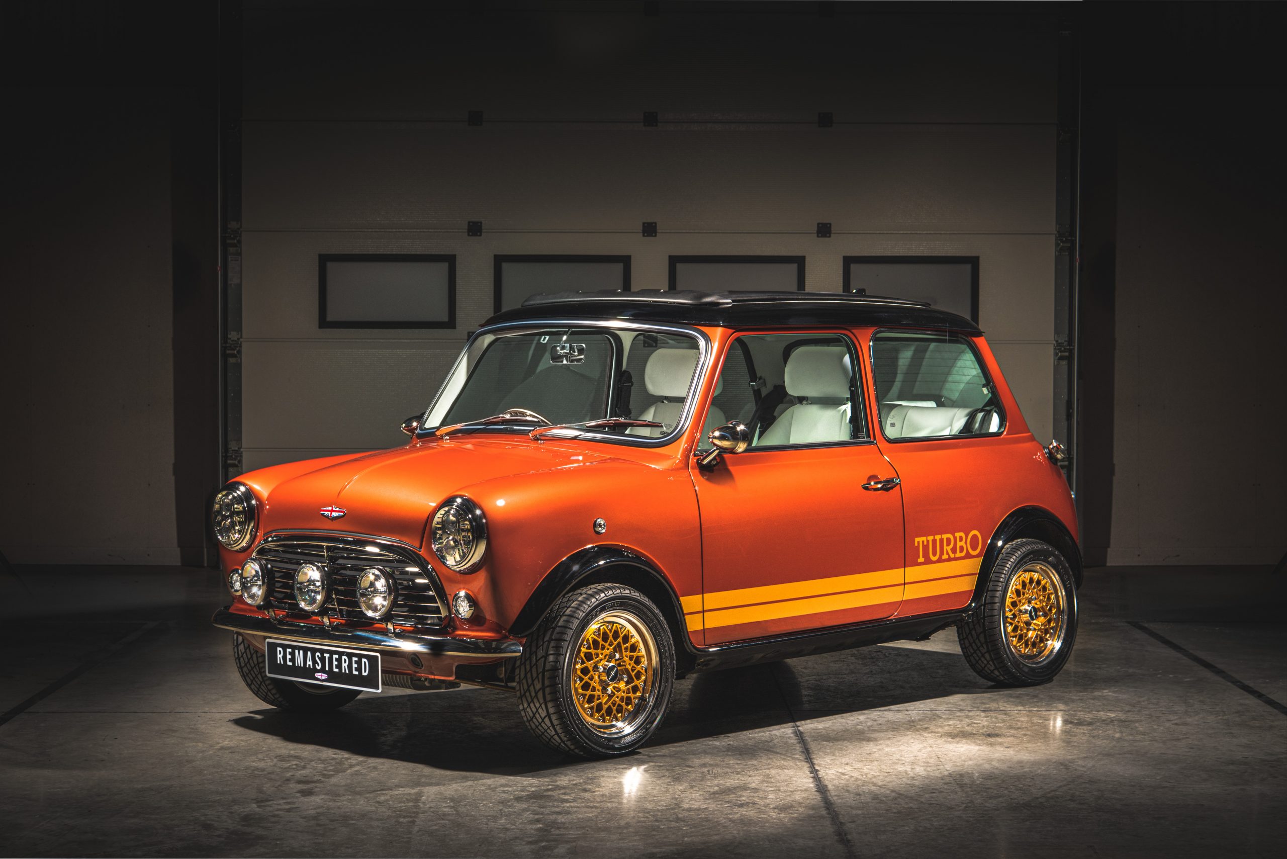The bespoke exterior paint finish of Lotus’ ‘Copper Glow’ is contrasted by David Brown Automotive’s ‘Fade to Black’ wheel arches and roof, accentuating the lines of the distinctive body shape. Gilding down the side of this Mini Remastered is the famed ‘Turbo’ graphic, hand-painted in ‘Sahara Gold’, nestled between bespoke 13” alloys, also painted in ‘Sahara Gold’ and featuring black brake calipers. Beneath the bonnet you will find the 1330cc remastered A-series engine.