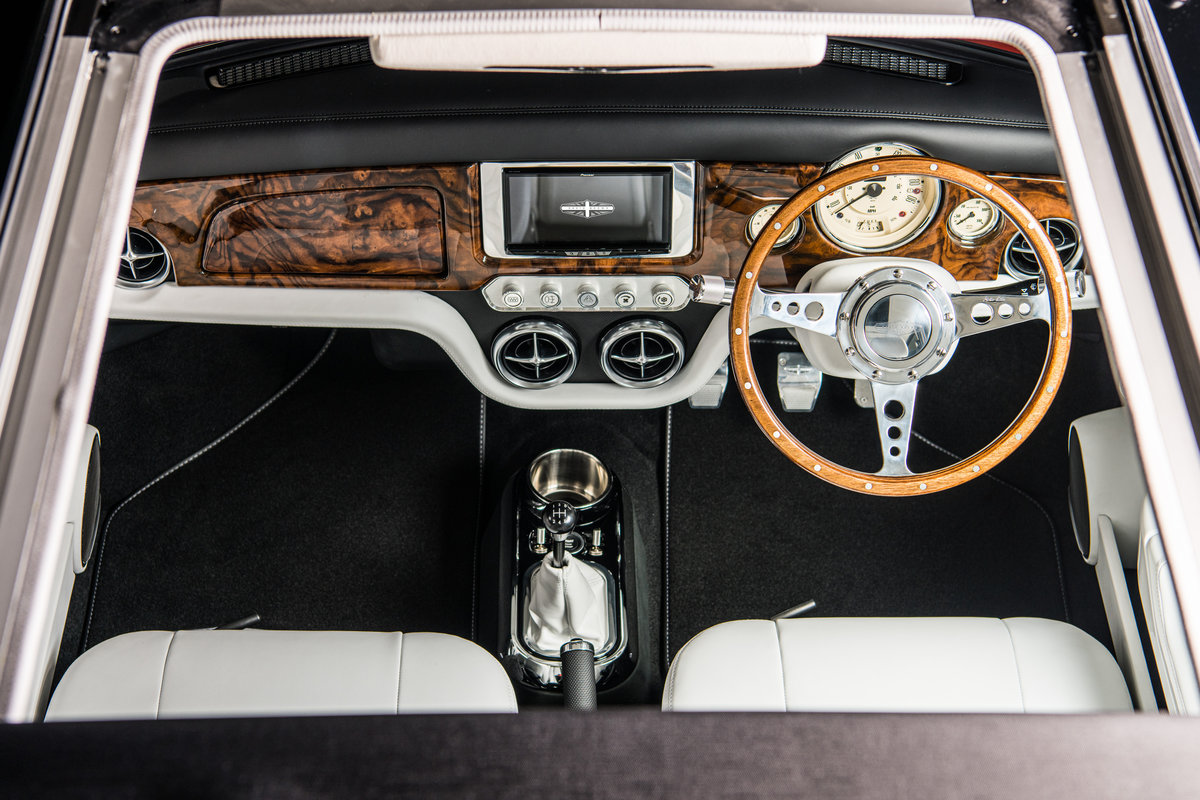 A panoramic sunroof opens to reveal a mini retreat, featuring a wood veneer dash in ‘Dark American Burr Walnut’; with a gloss lacquer to capture and distribute the sun light throughout the year. The ‘Arctic White’ leather upholstery, white Alcantara® headlining, ivory LED illuminated Smiths® dials and ‘Day Tripper’ painted trim combine to achieve an interior consisting of a perfect balance of contemporary and classic features.