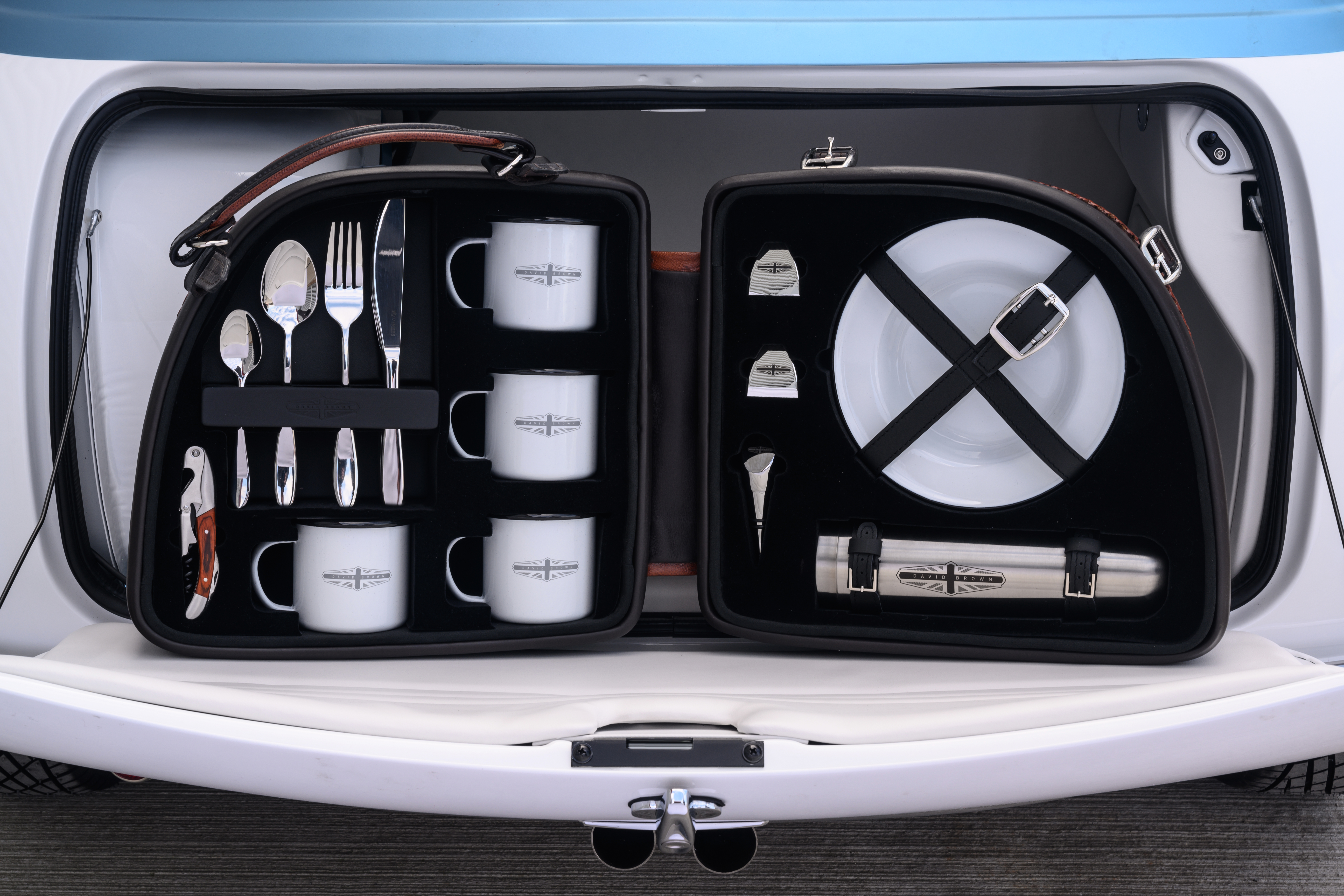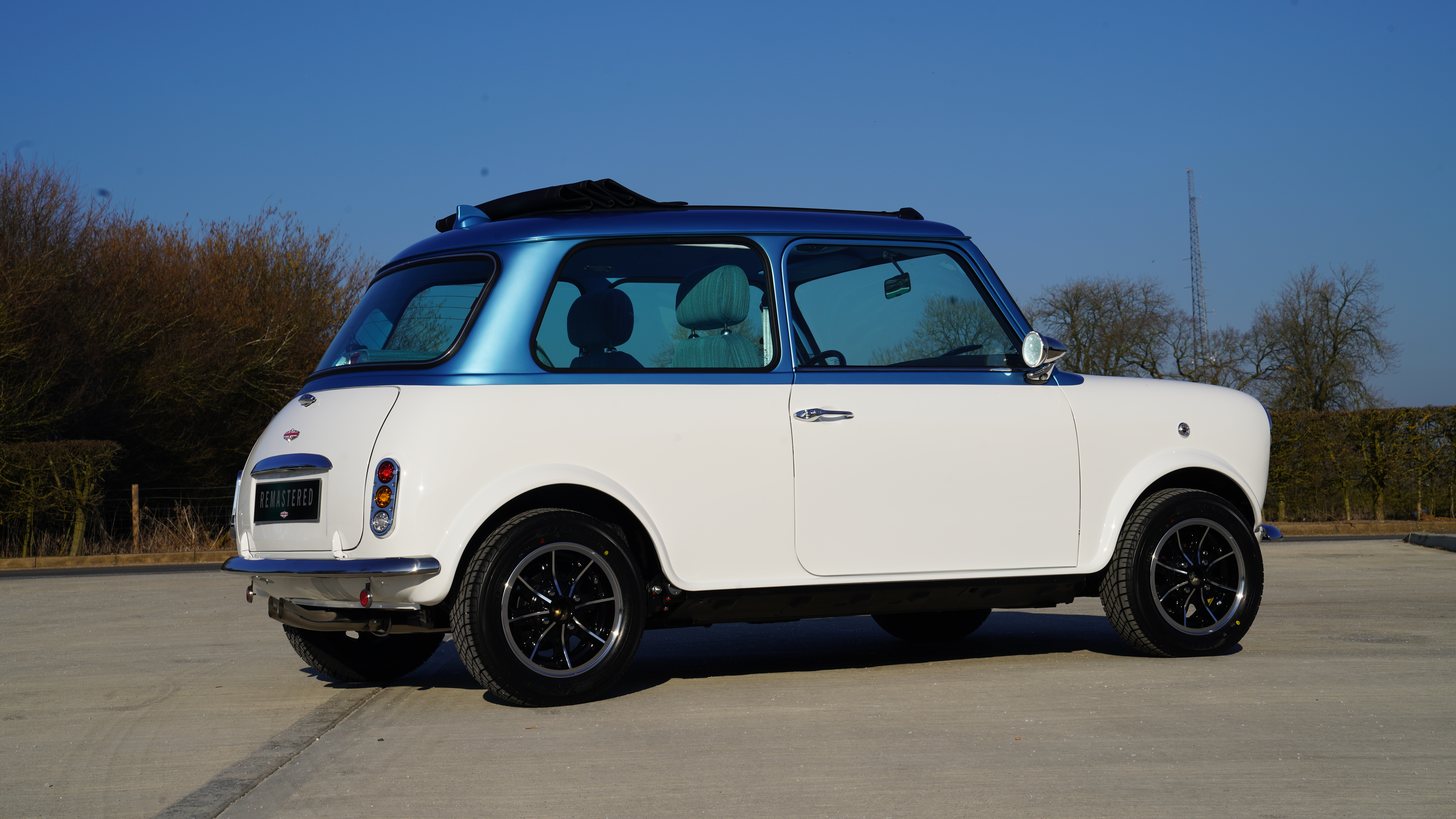 The latest Mini Remastered features a two-tone paint finish, with our ‘Day Tripper’ solid white for the lower body, matte ‘Electron Blue’ for the pillars and gloss ‘Electron Blue’ for the roof. The hand-painted nature of the exterior ensures that the paint finish shimmers throughout your day trip.