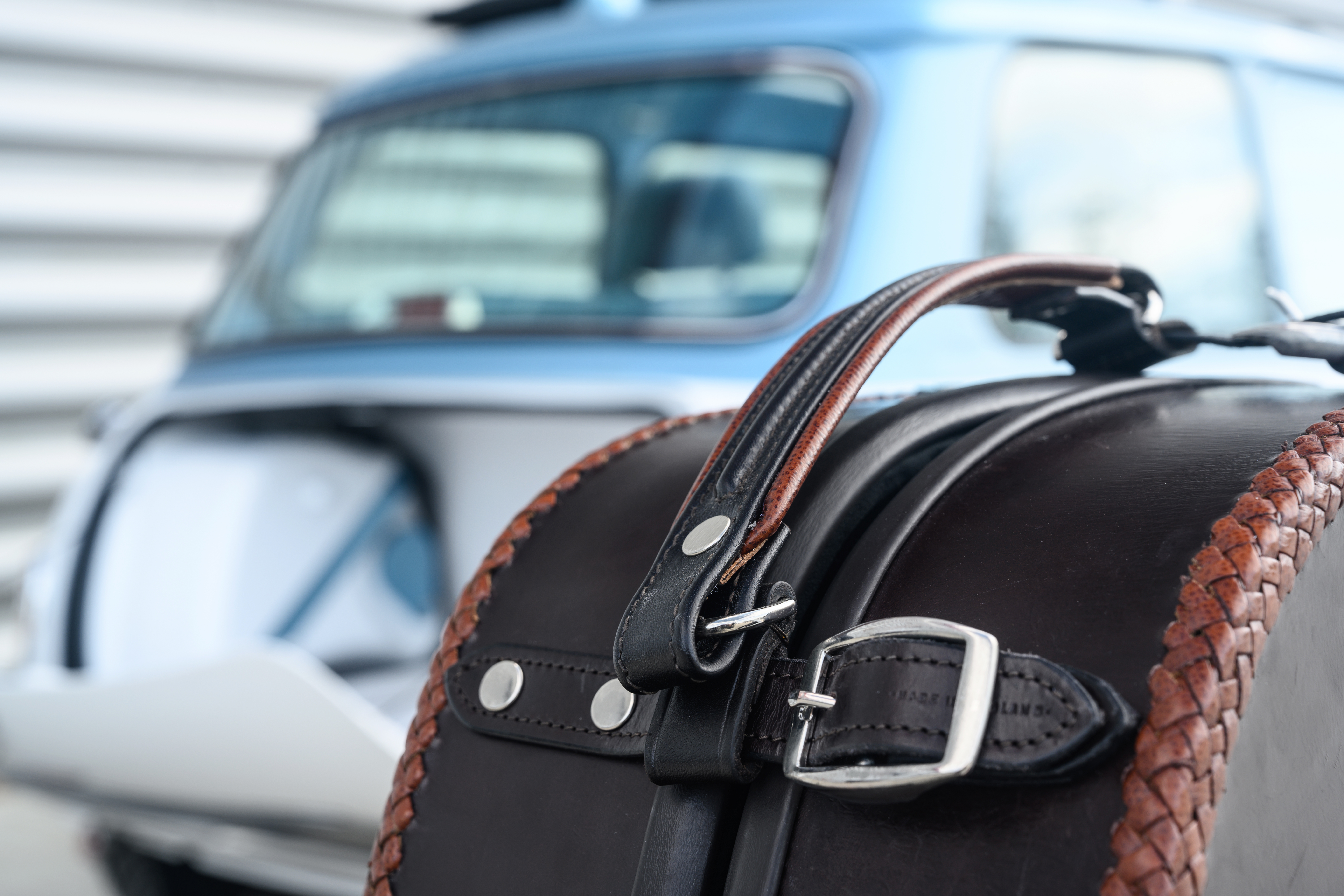 The latest Mini Remastered features a two-tone paint finish, with our ‘Day Tripper’ solid white for the lower body, matte ‘Electron Blue’ for the pillars and gloss ‘Electron Blue’ for the roof. The hand-painted nature of the exterior ensures that the paint finish shimmers throughout your day trip.