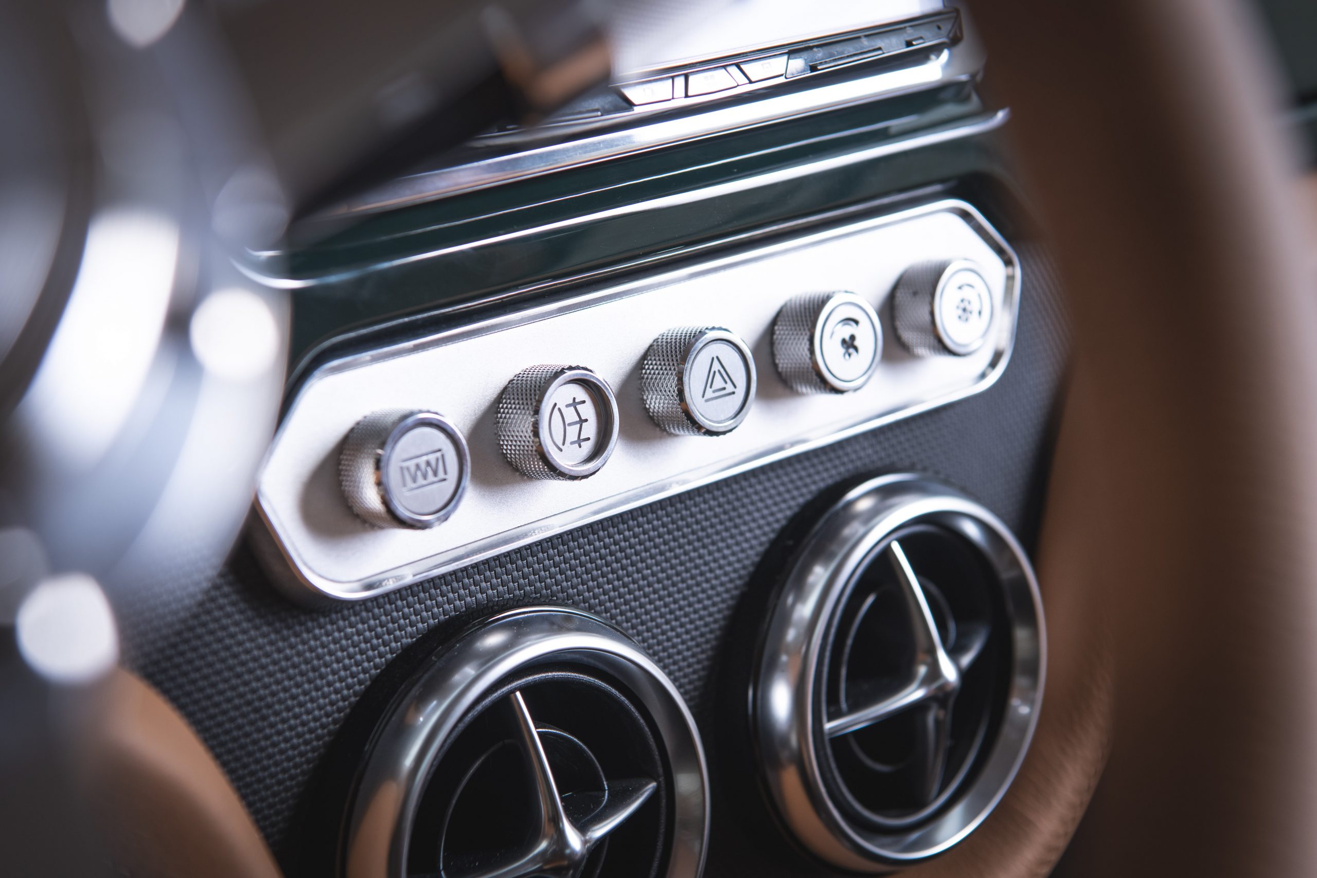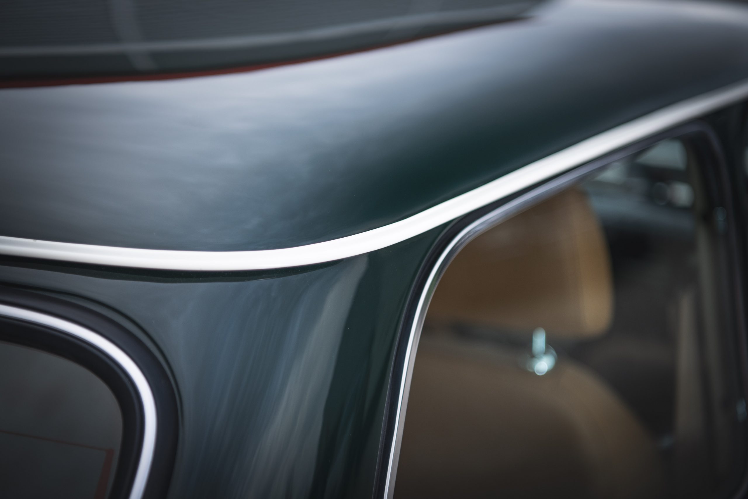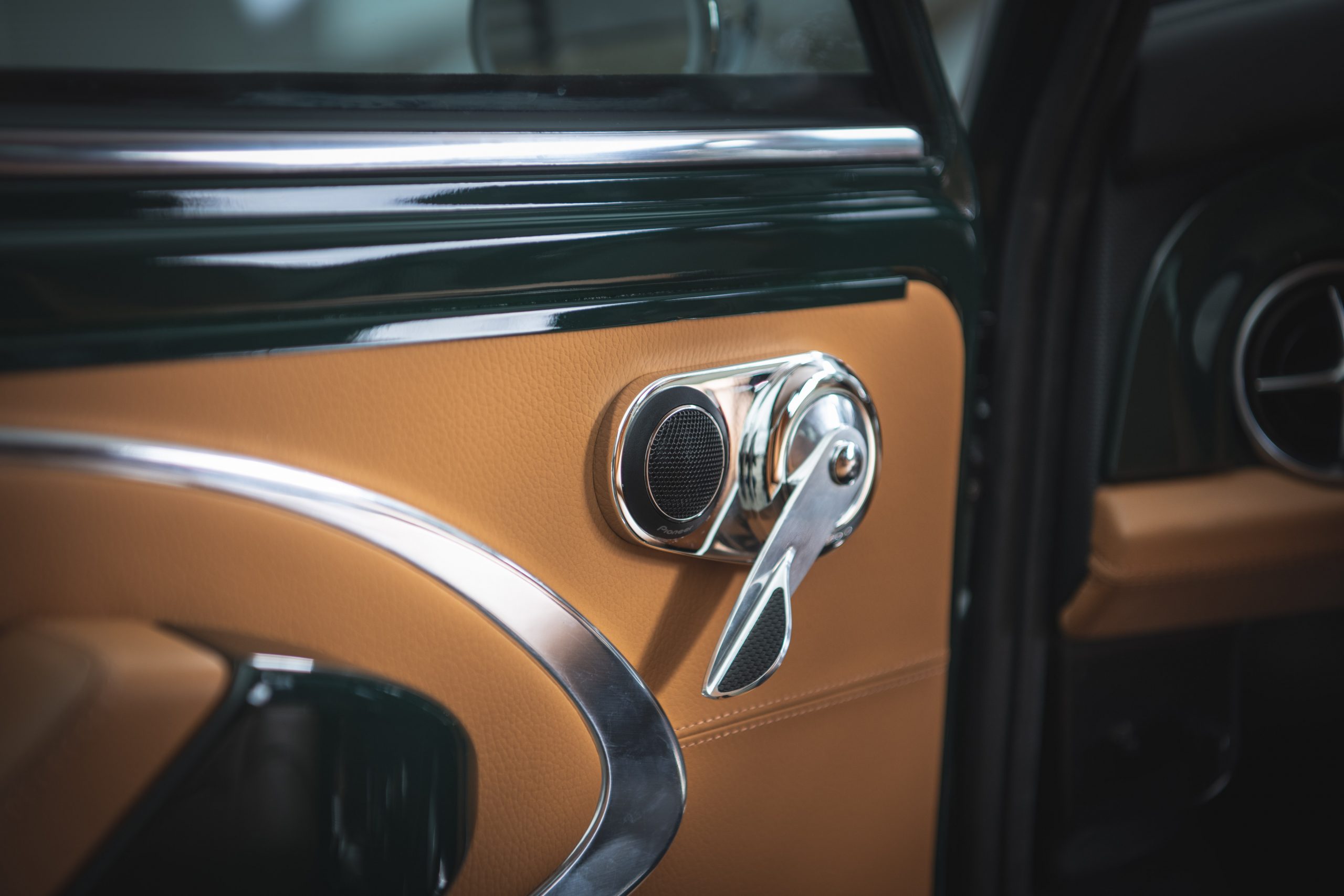Chrome door handles grant you entry into the cabin, where you will be struck by a perfect blend of ‘Racing Green’ trim and ‘Sandalwood’ leather upholstery, complete with matching stitching and tan seatbelts. A ‘Cream’ Dinamica® headlining and Ivory LED illuminated Smiths® dials tie together with the exterior ‘Latte’ accents, to complete a stunning commission.