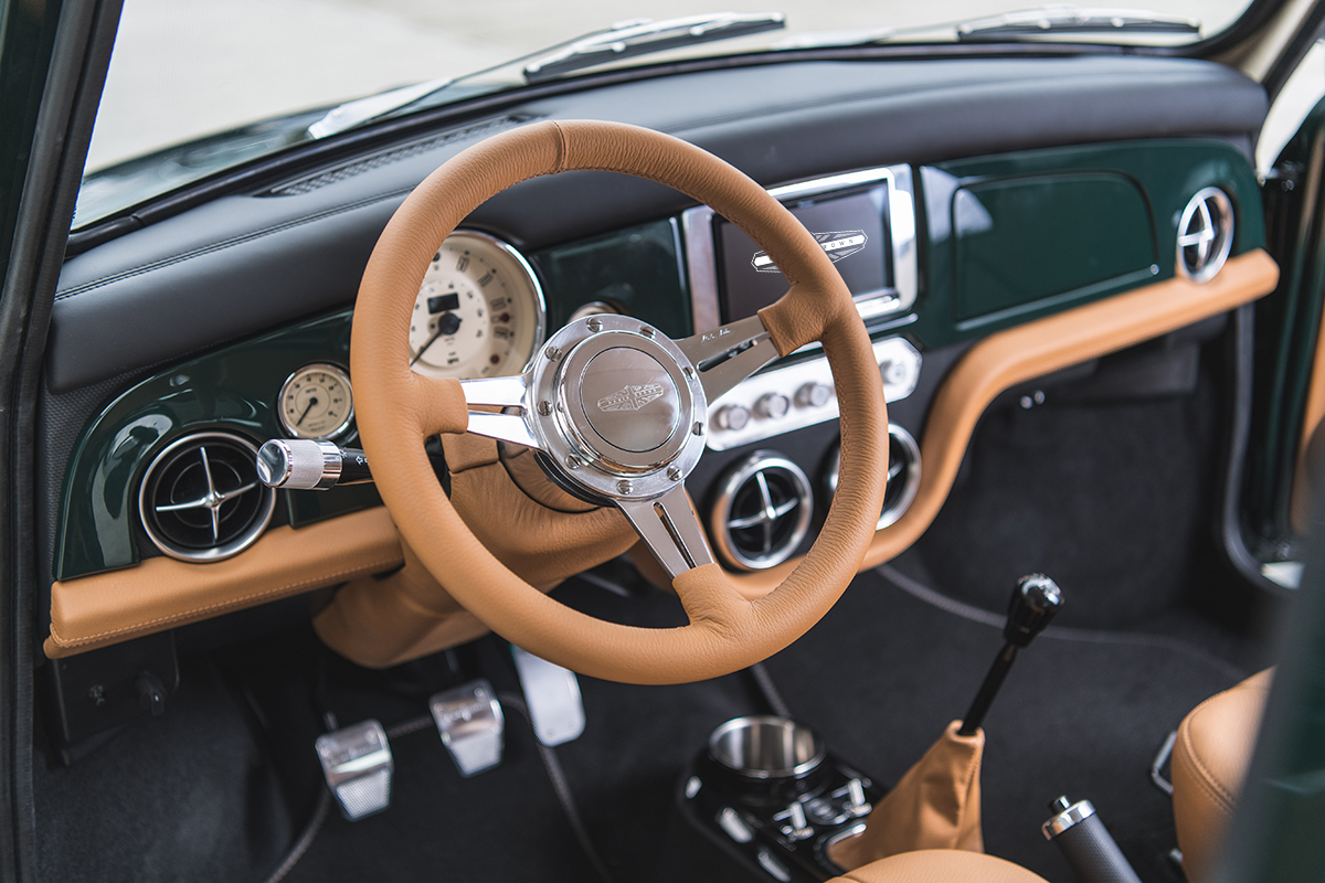 The latest Mini Remastered commission to depart our Silverstone build facility sports a colour palette associated with many British classic cars. This distinctive and bespoke exclusive ‘Racing Green’ exterior colour affirms Mini Remastered’s status as a classic, British icon, reimagined for the 21st century.